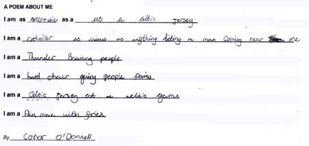 ![]() The boys in St Michael's explored language and communication for their second workshop with Chris and Aneta. The first activity involved the creation of a very unusual piece of poetry in either Polish or English. The structure of the poem was based on a very old type of Irish poetry so this really was a multilingual approach. If you were a colour, an animal, an item of furniture, clothing or food or even a type of weather what would you choose? ![]() ![]() |