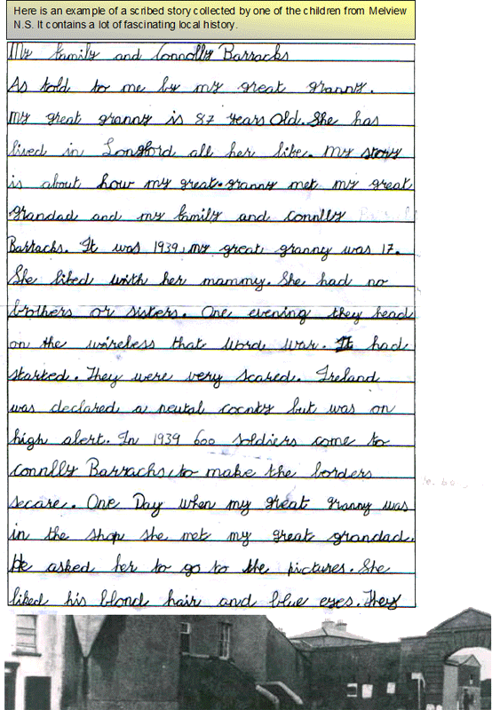 Many of the students were inspired by the stories frim the Folklore Schools' survey of 37/38. It was a special moment when one of the children from Melview realised that the tailor, Patrick Fagan, referred to in one of the stories was her great Grandfather. She brought in his birth certificate to show the class. Read this story.