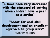 Infant and lower junior teachers find that the extension sheets, provided for a whole class allow them to write with individuals or small groups. Hearing a child listen to their Scribed story read back always illustrates clearly the pride they always take in these stories.